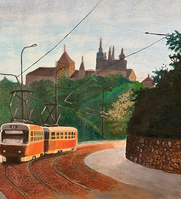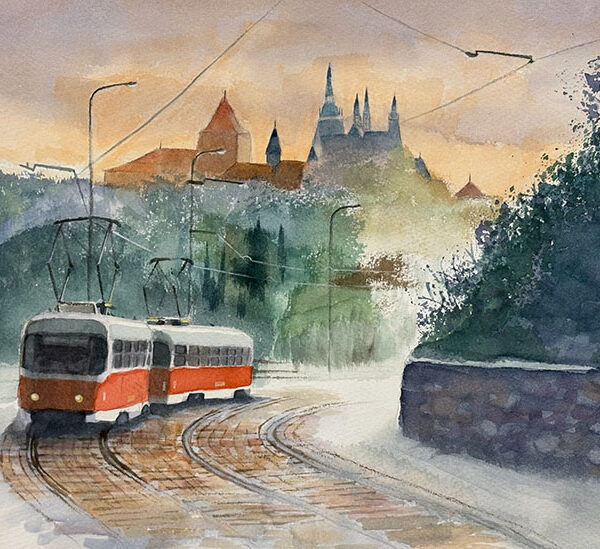 藤原まゆみ「古城と路面電車」F4水彩