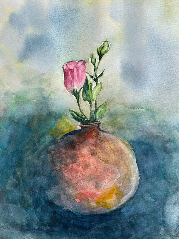 鈴木桂「バラと陶器と2枚貝」A4 水彩