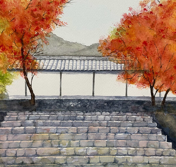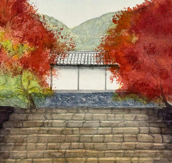 岩瀬民子「白壁と紅葉」F4水彩