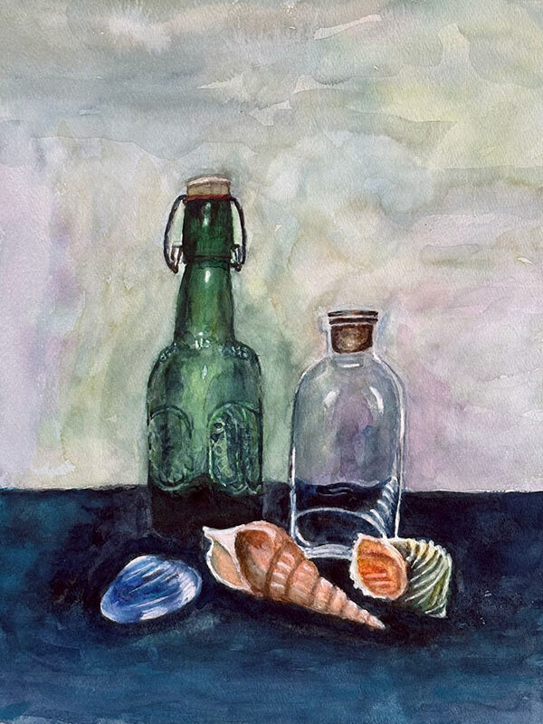 ひらまつ三恵子「貝殻とガラス瓶」F4水彩