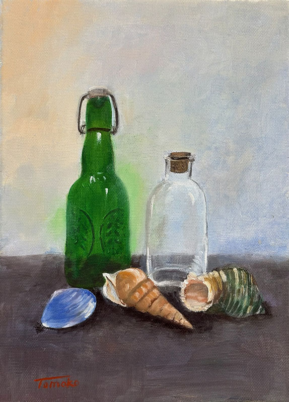 岡田智子「貝殻とガラス瓶」F4油彩