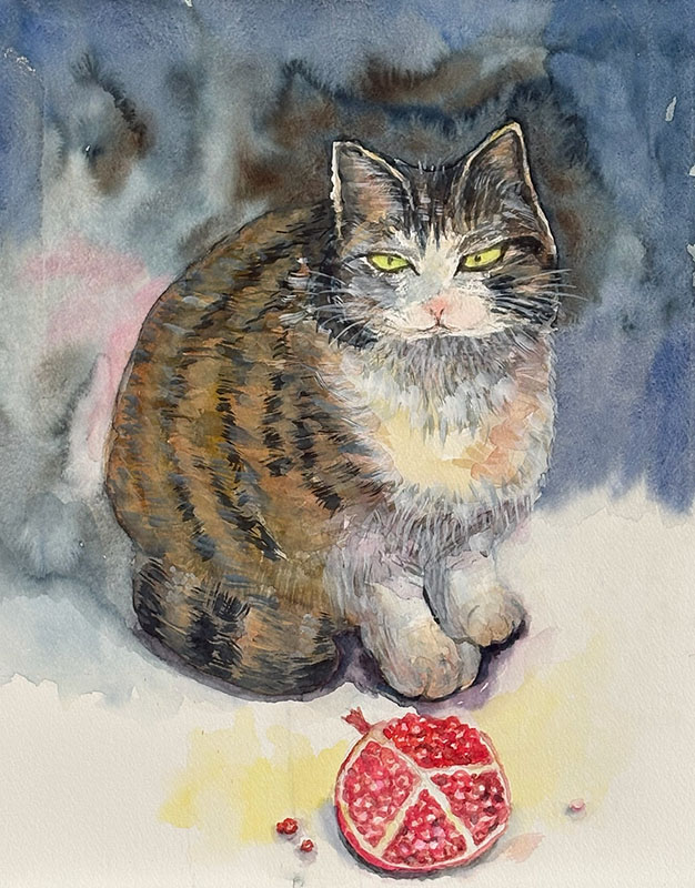 平野秀男「猫と柘榴」F6 水彩